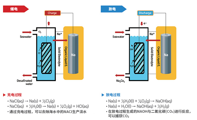 海水电池是通过溶解在海水中的钠离子和水的化学反应进行充放电的二次电池,是用海水代替正极的环保、低成本、安全的电池系统。与现有电池不同,由于没有正极部分,因此可以以相同的大小和重量,提供两倍的能量,或者可以以一半的大小和重量,储存相同的能量,而且不会因冲击和高温而发生爆炸。由于海水里有无限的钠离子,因此不会因反复充放电而导致电池衰减,与锂离子等目前广泛使用的电池不同,由于不使用韩国完全依赖进口的稀有金属--锂,因此可以确保技术独立性,价格也会随之降低。
