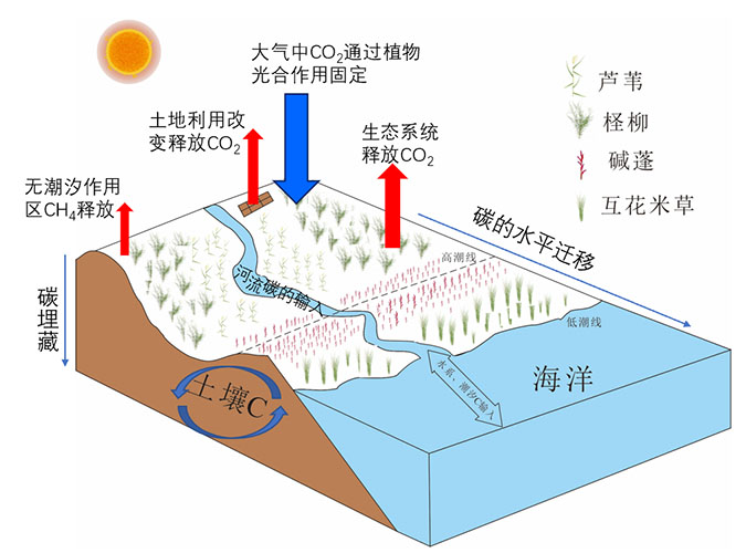 滨海盐沼湿地生态系统碳库大致可分为三个部分,主要包括地上生物量、地下生物量以及土壤碳库。其土壤碳库主要由内源碳和外源碳组成,外源碳是通过水系输入至盐沼系统,而内源碳主要来自盐沼湿地系统中的大型植物或藻类的光合作用,但内源碳大部分以二氧化碳或甲烷形式返回到大气中。