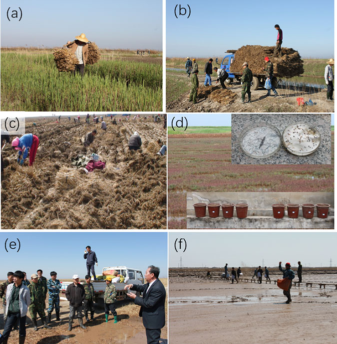 (注:a. 芦苇种苗采集;b. 芦苇种苗输运至示范区现场;c. 芦苇种苗种植;d. 翅碱蓬种子发芽试验与种子优选;e. 翅碱蓬种子输运至示范区现场;f. 翅碱蓬播种)