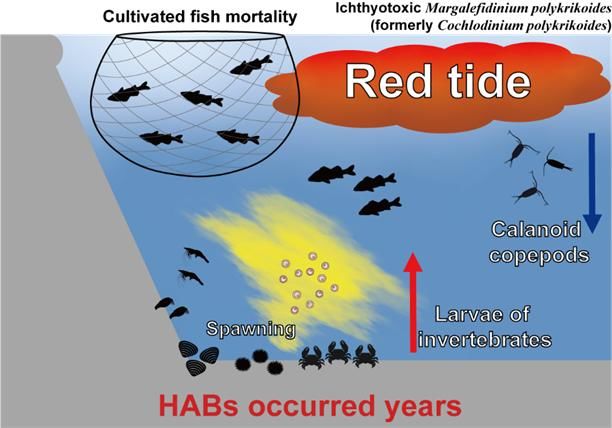 赤潮现象主要发生在夏季,是由分布在海洋中的一种叫多环马格里夫藻(Margalefidinium polykrikoides)的浮游植物快速增殖引起的。它附着在鱼的鳃上并降低氧气交换能力,导致鱼类死亡并破坏养殖鱼类和海洋生态系统。