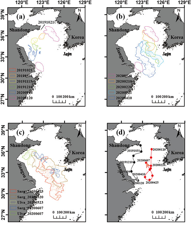 분석 결과에 따르면, 황해와 동중국해 북부에서 나타난 부유 금조는 2019년 10월~ 2020년 6월 사이에만 탐지되었고, 30°N 부근에서 시작된 2갈래의 표류 경로를 보였다(그림1 참조). 서쪽 경로에서 부유 금조는 2019년 10월 하순에 산동(山东) 반도에서 발견되었고 그 후 중국 연안을 따라 남쪽으로 표류해 2020년 1월 장쑤성 북부 여울에 도착 (그림2 참조), 1월말에 사라졌다. 동쪽 경로의 경우, 2020년 1월 123°E 동쪽 해역에서 먼저 발견되었으며, 초기 분포 면적이 23,000 km2에 달했다. 이후, 남쪽으로 이동하며 황해 중부와 동중국해 북부에 영향을 미쳤고, 4월 이후 계절풍을 따라 북쪽으로 이동해 6월 하순에 사라졌다. 최근 5년 동안의 위성 원격 탐사 수치에 대한 연구를 통해 본 해역의 금조는 동쪽과 서쪽 2개의 이동 경로를 보이지만, 발생 시간과 강도에 있어서는 경년별로 변화가 있다는 바를 발견했다.