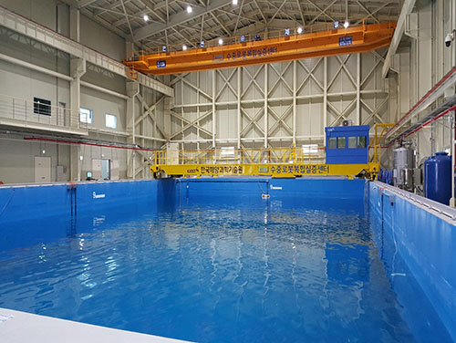 현재 국내에는 약 30여개의 수조가 각각의 목적에 따라 구축 및 운영되고 있으나, 주로 선박 및 항만 모형실험을 위한 용도로 쓰이고 있으며 10톤 이상의 대형 수중 장비의 실험이 가능한 곳은 전무하다. 경상북도와 포항시의 지원으로 영일만 3일반 산업단지에 구축된 수중로봇복합실증센터(Underwater Robotics Test & Evaluation Center, UTEC)는 수중로봇 실험을 위해 실제 해상과 가장 유사한 환경을 구현하도록 3차원수조와 대형 회류수조를 갖춘 전문 연구시설이다(그림 8). 바다 현장의 불확실성 요소들을 배제하고 사전 검증이 가능하여 효율적인 테스트 및 결과 도출에 도움을 줄 수 있다. 수중로봇복합실증센터 내 수조 시설인 3차원수조는 길이 35m, 너비 20m, 깊이 9m이며, 수심 5m 지점에는 관측창이 설치되어 있으며, 5개의 수중카메라를 통하여 다각도에서 실험 대상체의 수중 내 상태를 육안으로 확인이 가능하다.