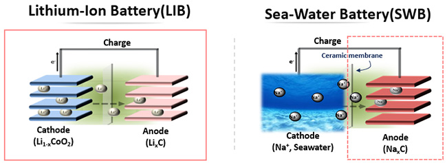 그림 1. 기존 배터리와 해수배터리 개념 비교