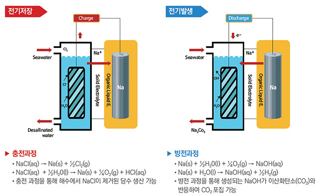 또한, 해수배터리는 다양한 부가 기능을 제공한다. 해수의 NaCl을 이용해 전기에너지를 충전하기 때문에 충전이후 해수는 담수화 된다. 방전 중 생성되는 수산화 나트륨(NaOH)은 해수에 존재하는 이산화탄소(CO2)와 반응하므로 CO2 포집이 가능하다. 또한, 충∙방전 중 발생되는 소량의 차아염소산(HOCl)을 통해 해수의 살균이 가능하다. 1석 N조 배터리라 할 수 있다.