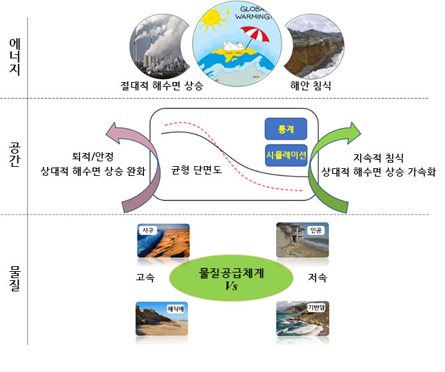 연안역은 하나의 전체로서 '물질-에너지-공간' 즉, '퇴적물 공급원, 유체역학적 조건, 상호작용영역'이라는 세 가지 요소 간의 상호 견제와 균형 메커니즘이 존재하며, 연안역의 '물질-에너지' 균형이 깨져 새로운 균형점을 설정하는 과정은 작용 영역이 공간적으로 전진하거나 후퇴하는 것으로 나타난다(그림 2). 연안역의 안정성은 주로 퇴적물 공급과 해양 에너지 사이의 균형 관계에 의해 제어된다. 전지구 기후변화는 절대적인 해수면의 상승과 극한 기후 현상의 증가를 초래하며, 이에 따른 유체역학 강화는 해안 침식을 악화시킨다. 다른 한편으로, 인간활동은 물질의 운반 방식과 공급량을 변화시켜 해수면 상승의 침식 효과를 더욱 가중시킨다. 따라서, 연안역의 퇴적물 축적과 유체역학적 변화의 동기화 관계는 물질 공급과 해양 에너지 간 균형관계를 분석하는 핵심 열쇠이자 해안선의 변화추세를 탐구하는 이론적 기초이기도 하다.