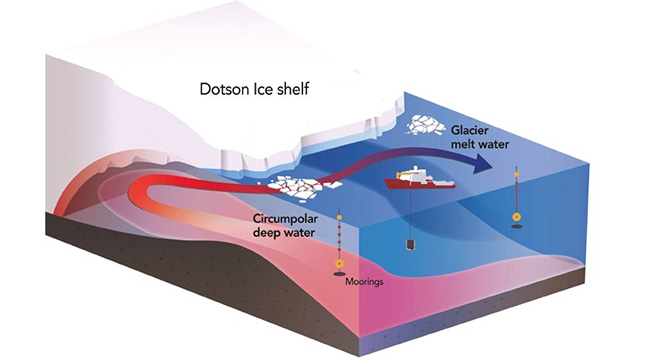 남극해는 표층에 남극표층수가 있고 중층에는 환남극심층수(Circumpolar Deep Water)가 있는데 환남극심층수는 북대서양에서 침강하여 대서양 연안을 따라 남하한 물이 남극의 강한 서풍제트기류에 의해 심층에서 중층까지 올라온 물로서, 남극의 일부 연안(아문젠해와 벨링스하우젠해)에서는 대륙붕까지 올라와 빙붕 하부를 녹이는데 중요한 역할을 한다. 남극 빙하는 서남극을 중심으로 많은 양의 융빙이 일어나는데, 이는 환남극심층수가 빙하 하부를 녹이기 때문이며, 이렇게 녹은 물은 장기적으로는 전지구 해수면을 올리는데 기여할 것으로 여겨진다.