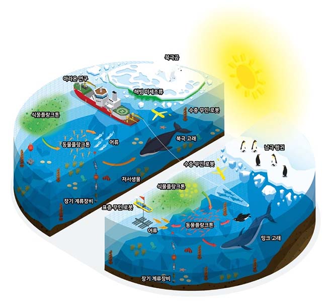 북극은 남극과 달리 대륙으로 둘러싸인 해양으로 구성되어 있고, 육지에는 동토와 그린란드 빙하로 이루어져 있다. 북극해의 경우, 태평양에서 베링해협을 통해 북극으로 들어가는 저염의 여름 해수의 수온이 점차적으로 증가하면서 북극 해빙 감소에 영향을 주고 있으며, 동시에 대서양에서는 프람 해협을 통해 고염의 해수 유입이 강해져 북극해 내부적으로 열·염순환이 변화하고 있다. 극지해역은 대기 온도 상승, 해빙 및 그린란드 빙붕의 감소 등 지구온난화에 따른 급격한 해양환경변화를 겪고 있는데, 온난화에 따라 북극으로 흘러 들어가는 하천수의 유입량이 증가하고 있으며, 해양 탄소 흡수력의 변화, 해양의 산성화, 생지화학적 물질 순환 변화 등으로 이어져 기후 환경 변화에 영향을 주고 있다. 극지 해양의 변화는 해양-대기 기체 교환량에도 영향을 주고, 해양에서 만들어지는 에어로졸, 그리고 해양과 대기의 생지화학적 순환에도 영향을 미치고 있어 극지 해양 환경의 변화를 진단하고, 피드백 기작을 규명할 필요가 있다.