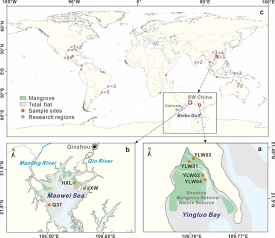 맹그로브는 다양한 생태계 서비스 기능을 수행할 뿐만 아니라, 자연 기반의 해결책으로 기후 변화를 완화하고 적응할수 있는 전략적 위치이다. 맹그로브의 과거 변이 과정과 환경 변화에 대한 반응을 재구성하는 것은 현재 맹그로브 보호 및 복원에 필요한 정보를 제공할 수 있다. 그러나 지난 세기 동안 맹그로브의 역동적인 변화와 인간 활동의 영향에 대한 이해는 여전히 제한적이다. 연구진은 중국 잉뤄만(英罗湾)과 마오웨이해(茅尾海)의 7개 퇴적물 코어에서 얻은 실험 데이터와 전 세계 40개 이상의 지점/지역에서 수집된 맹그로브 꽃가루, 안정 탄소 동위원소, 맹그로브 유래 유기 탄소, 그리고 맹그로브 면적 변화에 대한 데이터를 활용하여 지난 백년간 맹그로브의 역동적인 변화를 지역으로부터 전지구까지의 시각으로 재구성 하였다.