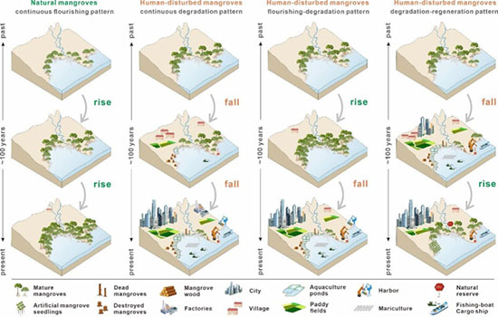 연구 결과, 지구 온난화로 인해 자연적으로 훼손되지 않은 맹그로브가 점차 번성하고 있는 반면, 인간 활동에 의해 훼손된 맹그로브는 (1) 지속적인 훼손, (2) 번영-훼손, (3) 훼손-재생의 세 가지 양상을 보인다는 것을 규명하였다. 예를들면 방파제 건설, 양식업, 농업 확장, 벌목, 도시화 등 인간 활동은 맹그로브의 자연적 번식을 억제하고 있음을 확인 할수 있었다. 본 연구 결과는 지난 세기 맹그로브의 변화과정에 대한 이해를 증진시켰고 향후 수십 년에서 수백 년에 걸쳐 효과적인 맹그로브 보호 및 복원 전략을 수립하는 데 도움을 줄 것으로 예상된다.